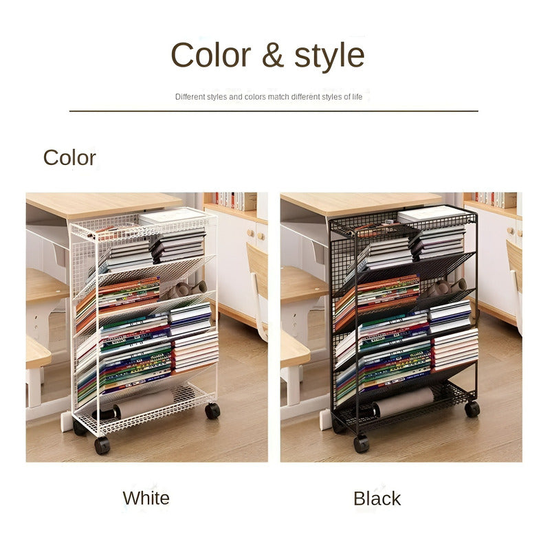 - Almacenamiento de clasificación: La librería móvil con compartimentos de almacenamiento de múltiples capas le permite clasificar y almacenar mejor libros, materiales, etc., el estante está inclinado con estantes inclinados de 20 cm de profundidad, los libros se pueden colocar horizontal y verticalmente, y es más conveniente tomar