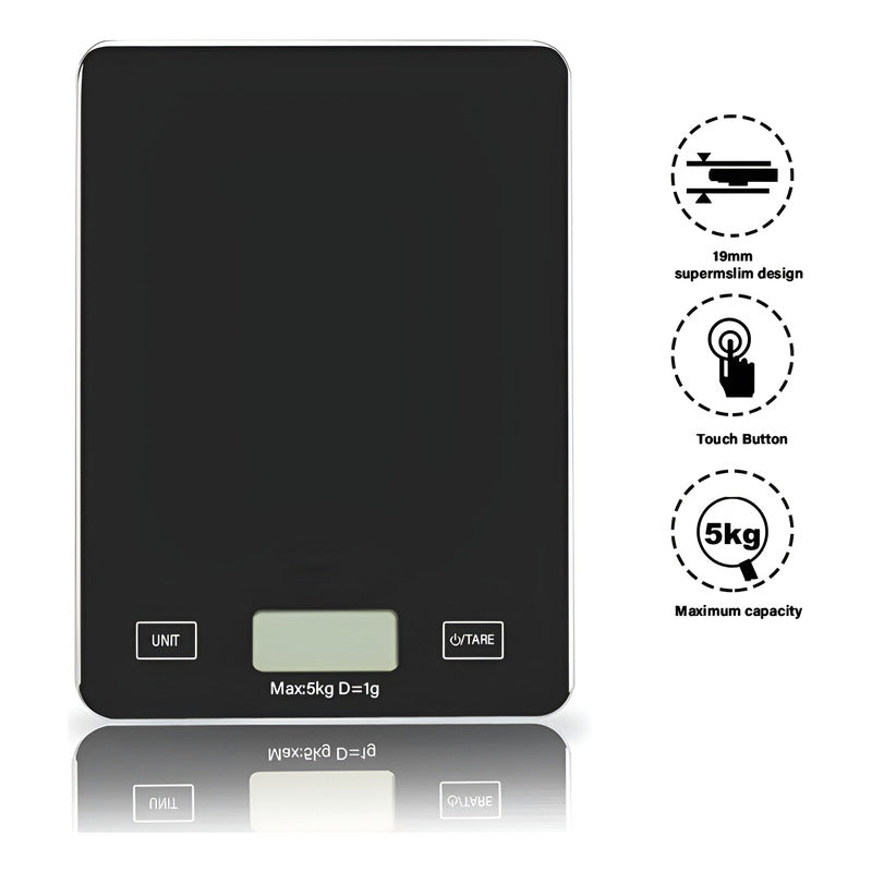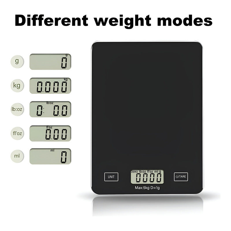 - Precisa y de gran capacidad: La báscula de cocina digital tiene cuatro celdas de carga de alta precisión incorporadas, que se pueden leer rápidamente en incrementos de 1 g/0,05 oz, y tiene una capacidad de hasta 5 kg, lo cual es conveniente para pesar una cucharada de azúcar o un trozo grande de carne.
