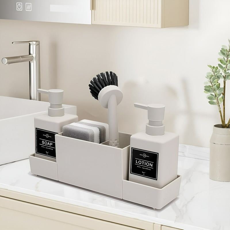 organizador lavaplatos porta esponja Optimiza el almacenamiento y la organización en la cocina y el baño, garantizando el orden. Puede satisfacer las necesidades del trabajo diario de limpieza. Adecuado para la cocina, cuarto de baño y otras ocasiones, también se puede utilizar como un soporte de utensilios. - Dispensador de jabón de Cocina Hecho de material ABS de alta calidad, textura dura y larga vida útil. La textura de la superficie mate parece más avanzada y es muy compatible con cualquier estilo decorativo de la cocina. - Compartimentos Individuales: Cada artículo se puede almacenar por separado, hay suficiente espacio para facilitar la ventilación y la colocación para evitar la humedad y el moho, también asegura que el organizador es más ordenado y se puede encontrar lo que busca directamente y rápidamente - Las botellas pueden contener hasta 350ML, todo al alcance de la mano, y puedes utilizar las pegatinas para marcar el tipo de jabón que utilizas. Con la bomba de presión, ¡puede dispensar fácilmente y reducir los residuos! - Multiusos: El juego de fregadero organizador de cocina viene con un orificio de desagüe, lo que lo convierte en un gran complemento para su fregadero tanto si lo utiliza en la cocina como en el baño. La esponja y el cepillo se pueden utilizar no sólo para lavar los platos, sino también para limpiar frutas y verduras, de forma sencilla y eficaz. Tu paquete incluye: - 1x Organizador - 2x Dispensador de jabón - 1x cepillo - 2x Esponja - 1x Pegatina impermeable -1x Cabezal de repuesto PASTELERIUSCL